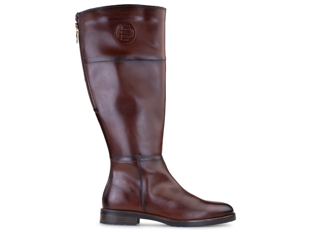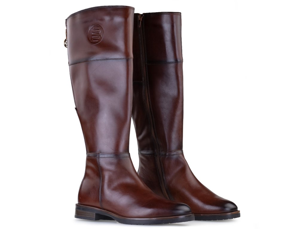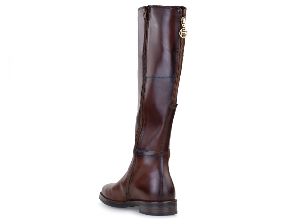 Krásně prošité i vybarvené kozačky v barvě kůže, ozdobené prolisem písmene B na lýtku. Na zadní straně boty si můžete díky klínku na zip zvětšit obvod lýtka.