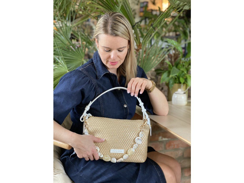 Italská kabelka z kůže a lýka s lehkým zlatým leskem přímo voní létem a skvěle podtrhne vaše letní outfity. Kabelku můžete nosit v ruce, na rameni nebo jako crossbody. Ozdobný řetízek si můžete odepnout.