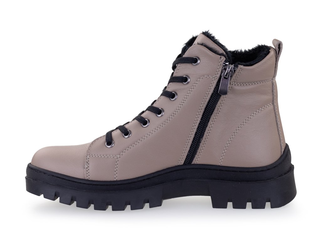Dámské kožené kotníkové boty s měkkou, ortopedicky tvarovanou stélkou. Tato obuv známé francouzské značky je vyrobena z hladké kůže a je vhodná na každodenní nošení. Díky vyjmutelné stélce je obuv velmi pohodlná. Pro snadné obouvání je na vnitřní straně boty umístěn zip.