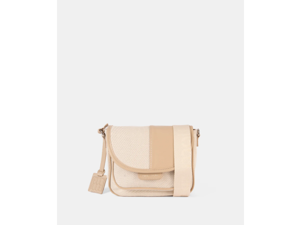 Dámská kabelka od španělské značky Pepe Moll. Crossbody v béžové barvě na širokém látkovém popruhu.