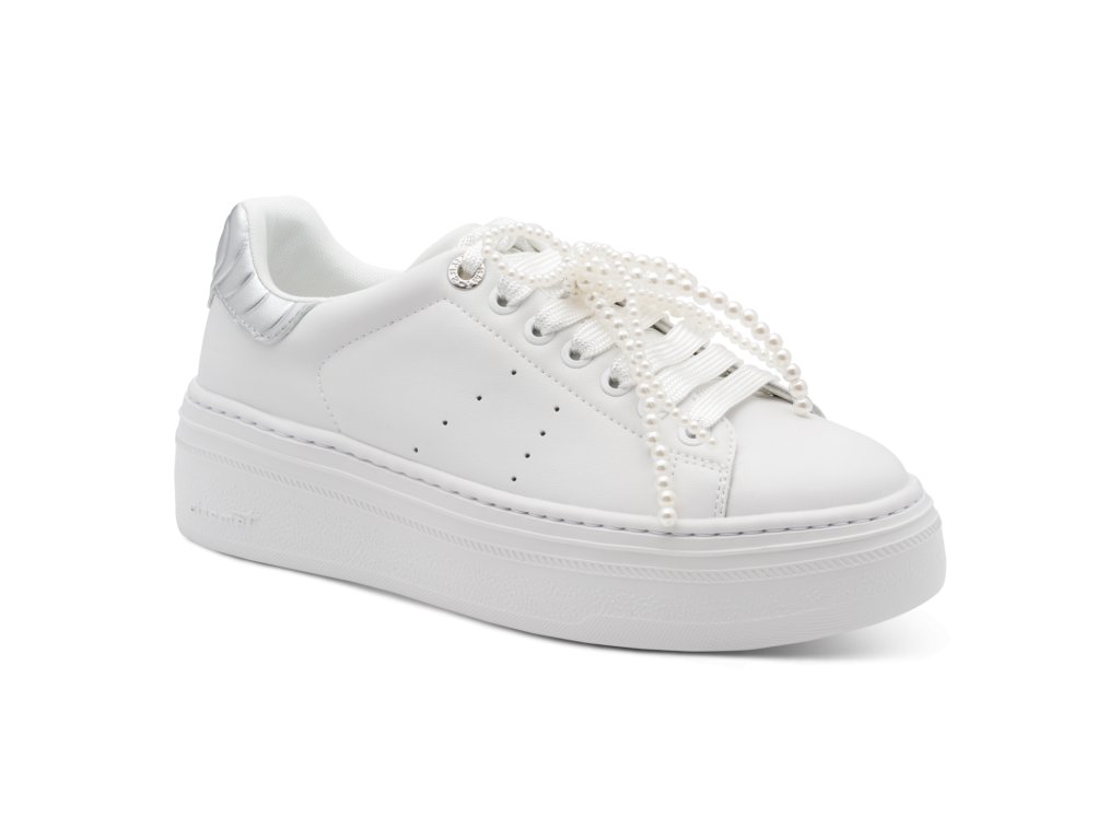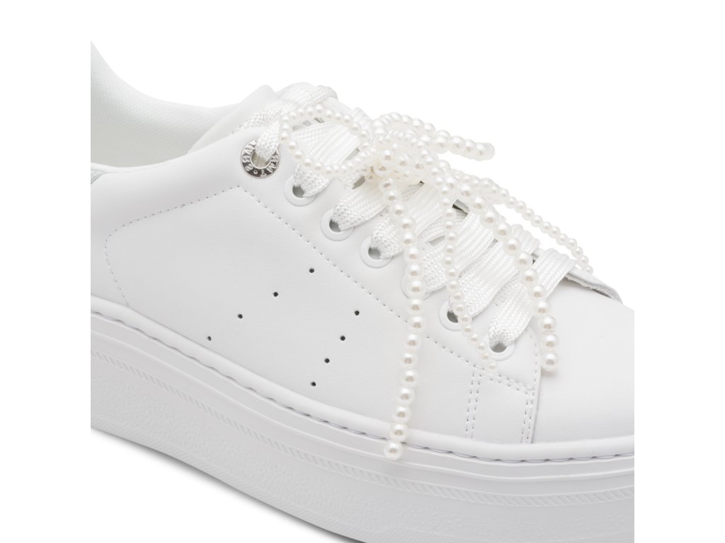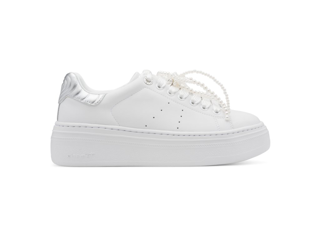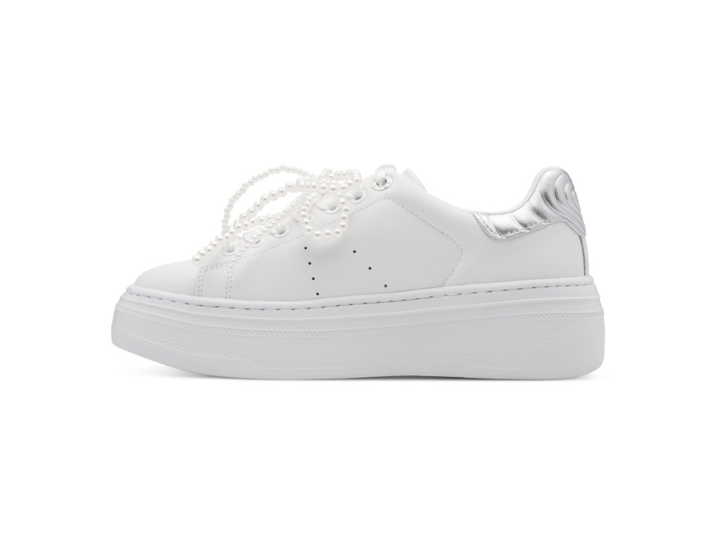 Bílé tenisky na platformě prodlouží Vaši postavu a skvěle se hodí také k rozšířeným kalhotám, ať už kratšího, nebo delšího střihu. Tenisky jsou zdobené perličkovou mašlí na nártu, kterou si můžete libovolně sundávat.