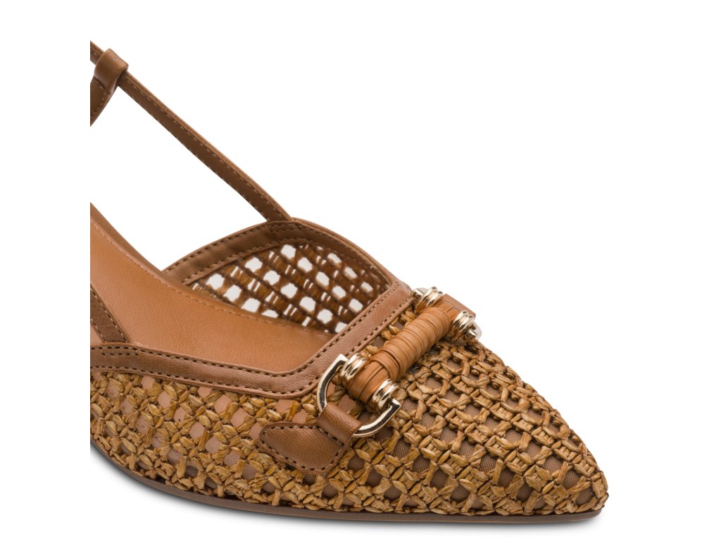 Lodičky na úzkém podpatku v přírodní hnědé barvě, zdobené sponou na nártu.