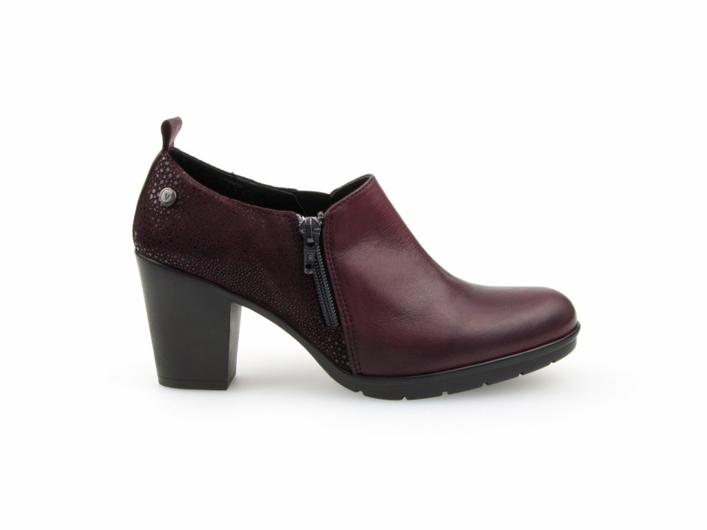 Dámské elegantní kotníčkové boty v módní bordó barvě. Přední část obuvi je vyrobena z hladké kůže, část nad patou je z kůže broušené. Zapínání je na zip z vnitřní strany.